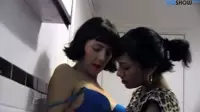In the dimly lit bathroom, the two lesbian friends stand before an empty sink, both feeling the heat of desire that courses through their veins.The brunette steps forward to meet her friend's eager lips, kissing with a passion that burns brighter than the flickering lights.Their hands explore one another's bodies hungrily, both knowing where this is leading, as their fingers dance along the curves of their partners.The blonde's soft hands caress the smooth skin of her ponytailed friend, bringing them even closer, until their bare breasts press against each other like two halves of a perfect whole.The brunette takes this opportunity to lift the hem of the tiny outfit, revealing an ass so round and firm, it makes her heart skip a beat.Her tongue trails from the delicate dip at the small of the blonde's back, tracing its way upward along the supple flesh until her mouth lingers at the center point, the wet evidence of desire that fills every corner of this room with sensual scent.The ponytailed friend can no longer resist the pull of the moment her hands drop between the two friends, spreading herself wide open for the blonde to explore the soft pink labia and swollen clitoris with her fingertips.The wet sounds of their passion meld into a harmonious tune, drowning out everything else around them, leaving them lost in the rhythmic pounding of their hearts.Their breathing becomes heavier, more rapid, each of them hanging on the edge of ecstasy, waiting for that moment when the floodgates will finally break and release a tidal wave of unbridled pleasure.The blonde's hands glide upwards from her friend's ass, gripping tightly to keep them both anchored as their lips meet in a deep, passionate kiss that fuses their souls.As the brunette's climax surges through her body like an electric current, her cries echo throughout the bathroom, reverberating off the tiled walls and joining the symphony of their orgasms.The blonde feels her friend tremble against her, sharing every sensation with her own body as they reach that pinnacle of satisfaction together.Their arms tighten around one another, sealing their connection as they continue to spiral higher, caught in an orbit of raw and unabashed lust.Once the waves of passion have subsided, leaving them both breathless and drenched in sweat, the friends come down from their ecstatic high, still held within each other's embrace.Their eyes meet with a mutual understanding – that this bond, forged in the steamy heat of their desire, will always be a part of them.The two lesbians exchange lingering smiles, basking in the afterglow of their erotic bathroom encounter, knowing they have opened an irrevocable door to their futures together.Their hands remain clasped around each other's bodies – fingers still intertwined, a silent promise of what lies ahead for both of these women, bound by a passion as unbreakable as the brick and mortar that holds up the very sink they lean against in this intimate space.